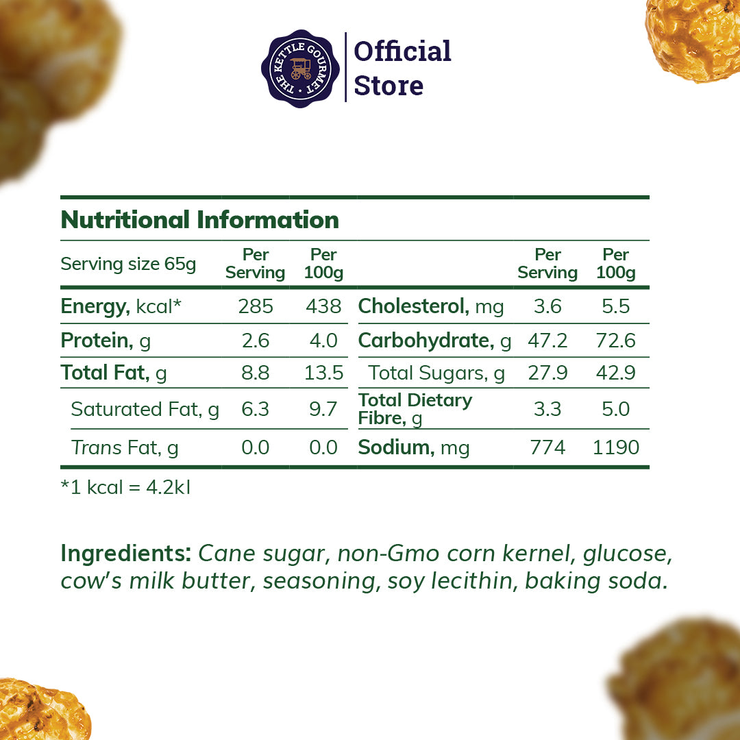 INGREDIENTS: Cane sugar, non-Gmo corn kernel, glucose, cow’s milk butter, seasoning, soy lecithin, baking soda.